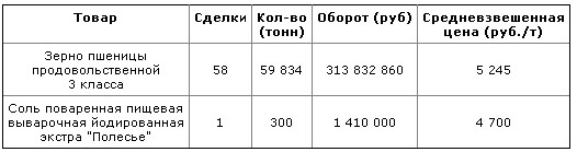 В третьем квартале 2012 года на биржевых торгах в отделении "Сельскохозяйственная продукция" было продано более 60 тыс. тонн продукции, что на 88% больше показателя второго квартала 2012 года, на общую сумму свыше 315 млн. рублей, что так же превышает показатель второго квартала 2012 на 85%.