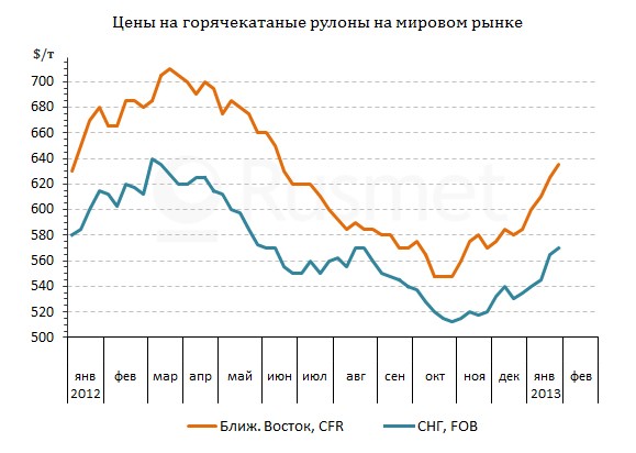 Рост цен на стальную продукцию внутри страны способствовало повышению интереса к импорту. Это дало возможность поставщикам из стран СНГ поднять котировки. Украинские горячекатаные рулоны вышли на уровень $550-560 за т FOB по сравнению с $520-530 за т в конце декабря, а российские компании установили стоимость своей продукции в интервале $555-570 за т FOB. Некоторые производители предлагали свою продукцию в Турцию и по $590 за т FOB, но пока без особого успеха. Европейский горячий прокат для Турции достиг $610-620 за т CFR, но реальные сделки, как правило, осуществлялись из расчета менее $600 за т CFR.