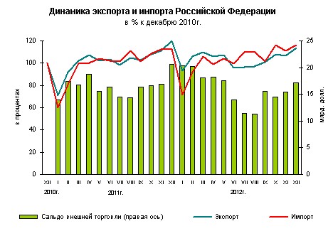 1. В январе-декабре 2012г. внешнеторговый оборот России составил, по данным Банка России, 864,7 млрд.долларов США (102,2% к январю-декабрю 2011г.), в том числе экспорт - 529,3 млрд.долларов (101,4%), импорт - 335,4 млрд.долларов (103,6%). Сальдо торгового баланса оставалось положительным, 193,8 млрд.долларов США (в январе-декабре 2011г. - 198,2 млрд.долларов).
