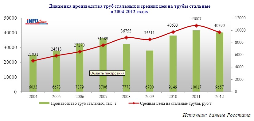В 2012 году производство стальных труб снизилось на 3,6% по сравнению с 2011 годом. Основной причиной сокращения производства стальных труб в рассматриваемом периоде является значительное сокращение спроса на трубы большого диаметра для строительства нефте- газопроводов. Кроме того, падение спроса со стороны нефтегазовых компаний на трубы большого диаметра привело к существенному снижению цен в данном сегменте металлургической продукции: индекс цен производителей на трубы стальные за 2012 год относительно 2011 года составил 89,6% по сварным трубам для нефте- и газопроводов из черных металлов наружным диаметром более 406,4 мм и 98,0% по трубам сварным для нефте- и газопроводов из черных металлов наружным диаметром менее 406,4 мм.