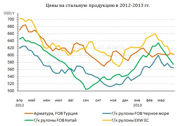 Вторым "слабым местом" на мировом рынке стали в марте предсказуемо оказалась Европа. Некоторые производители надеялись на повышение котировок в конце первого квартала, но слабость реального сектора региональной экономики перечеркнула эти расчеты. Спрос на прокат в большинстве стран Евросоюза оказался резко ограниченным. А события на Кипре, под знаком которых прошла вся вторая половина месяца, окончательно убавили деловую активность в Европе до минимума. Дистрибуторы и конечные потребители стараются минимизировать запасы стальной продукции, опасаясь нового спада, а аналитики прогнозируют на апрель снижение региональных цен на прокат не менее чем на 10 евро за т.