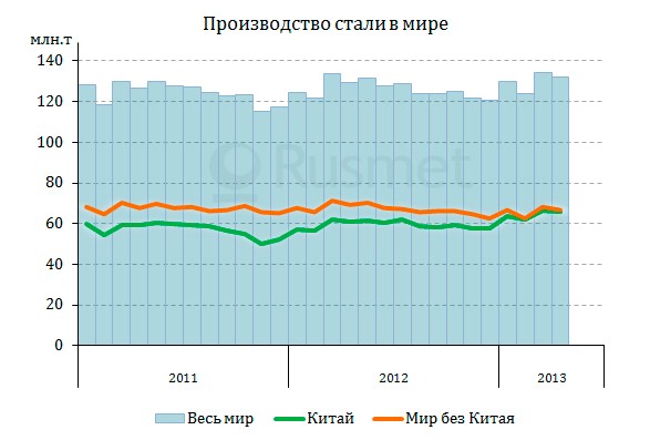 По данным World Steel Association (WSA), в апреле 2013 года в 63 странах мира, подающих свои данные в эту организацию, было выплавлено 132,1 млн. т стали, что на 1,8% меньше, чем в марте, но на 1,2% превышает показатели апреля 2012 года. Среднедневной объем производства стали – 4,35 млн. т – остался на том же уровне, что и в предыдущем месяце и лишь незначительно отстает от рекордного февральского уровня.