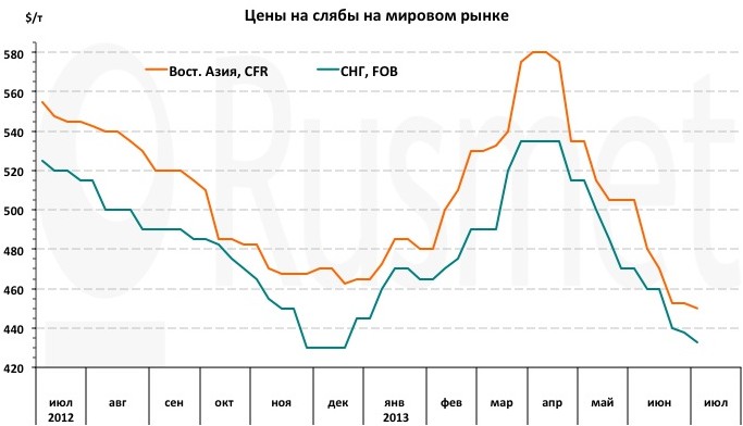 Правда, в конце мая – начале июня внутренние котировки на плоский прокат немного возросли, но вряд ли это поможет поставщикам товарных слябов добиться желанного повышения. По мнению специалистов, бразильским компаниям все-таки придется удовлетвориться ценами порядка $460-470 за т FOB. Очевидно, некоторое понижение котировок по сравнению с майским уровнем произойдет и в Азии. В нынешней ситуации поставщики полуфабрикатов могут рассчитывать, в лучшем случае, на минимизацию потерь. Возможности для восстановления цен на этом рынке появятся, судя по всему, никак не раньше второй половины июля. -- Русмет