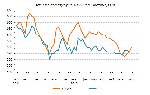 Прежде всего, в конце июня – начале июля активизировалась турецкая строительная отрасль. Напряженность в стране к тому времени начала сходить на нет, так что дистрибуторы и строительные компании, которые ранее не решались делать запасы, приступили к новым закупкам. При этом, турецким металлургам полностью удалось перенести на стоимость готовой продукции затраты, вызванные подорожанием сырья, а также снижением курса лиры по отношению к доллару. Если в двадцатых числах июня цены на арматуру в Турции находились на уровне $570-585 за т EXW, то в июле эта продукция подорожала до $580-600 за т EXW.