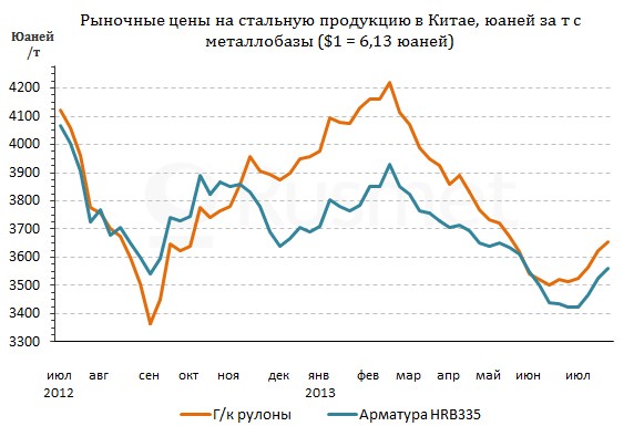 Достигнув в конце июня крайней точки спада, китайский рынок стали медленно пошел на подъем. С начала июля средний уровень внутренних цен на наиболее массовые виды проката прибавил порядка $20-25 за т. Многие металлургические компании в течение последних двух недель объявили о повышении котировок на август.