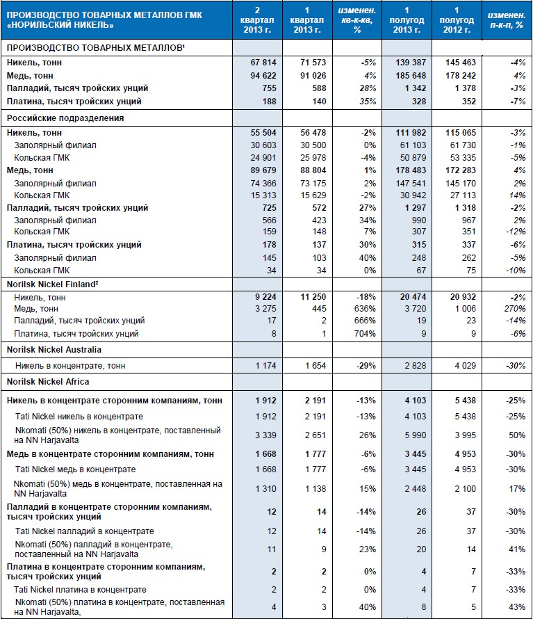 ГМК "Норильский никель" объявляет предварительные итоги производственной деятельности за ll квартал и l полугодие 2013 года.