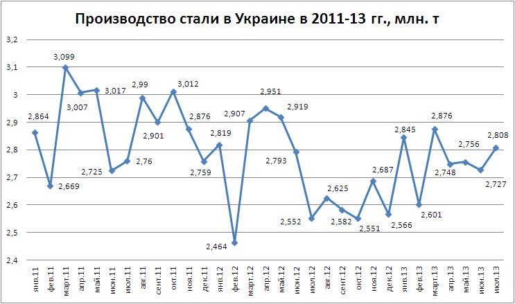 В январе-июле 2013 г. украинские металлургические предприятия сократили производство стали по сравнению с аналогичным периодом прошлого года на 0,2%, до 19,350 млн. т, тогда как нарастили чугуна на 0,9%, до 16,951 млн. т.