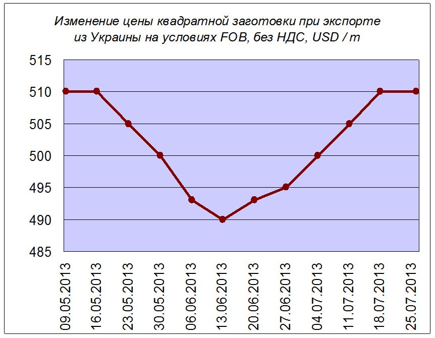 Квадратная заготовка дешевела до середины июня. Но после этого начался рост цен, даже несмотря на то, что на основном рынке сбыта – в мусульманских странах Ближнего Востока и Северной Африки – в это время вовсю готовились к священному месяцу Рамадан (в 2013 году с 9 июля по 8 августа). По данным УПЭ стоимость квадрата, экспортируемого из Украины, достигла локального минимума в середине июня на уровне 490 долл./тонн, что на 10 долл. (-2%) меньше цены, зафиксированной в конце мая. Однако за последующие полтора месяца стоимость квадрата вернулась на апрельский уровень 510 долл./тонн. Аналитики "Металл-Курьера" в июне зафиксировали снижение цены на 9 долл. (-1,8%) до 488 долл./тонн. Начиная с середины июня, полуфабрикат дорожал и к концу июля достиг 509 долл./тонн (+21 долл. или 4,3%).