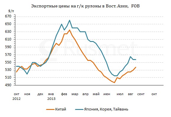 В настоящее время китайские компании предлагают на экспорт горячекатаные рулоны с поставкой в сентябре-октябре не менее чем по $540-550 за т FOB, а стоимость толстолистовой стали достигает $530-550 за т FOB. Не отстают от них и металлурги из других стран региона. Корейские компании еще в конце июля установили цены на горячий прокат на уровне $560-575 за т FOB. Японские и тайванские производители котируют свою продукцию в интервале $555-570 за т FOB, но при этом японцы открыто заявляют о намерении дойти до $600 за т FOB в четвертом квартале.