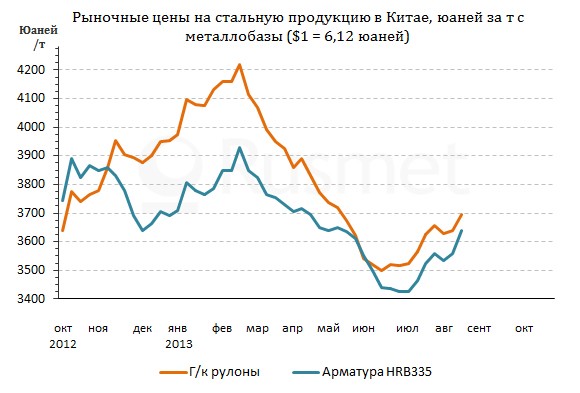 Как отмечают металлурги, рост цен сопровождается активизацией спроса. Многие потребители восприняли подорожание арматуры до 3600 юаней ($588) за т со склада как сигнал к началу закупок. Кроме того, на стоимость стальной продукции, безусловно, воздействует железная руда, впервые с апреля поднявшаяся выше отметки $140 за т CFR Китай. Кстати, цены на плоский прокат в стране пока еще довольно далеки от апрельских показателей.