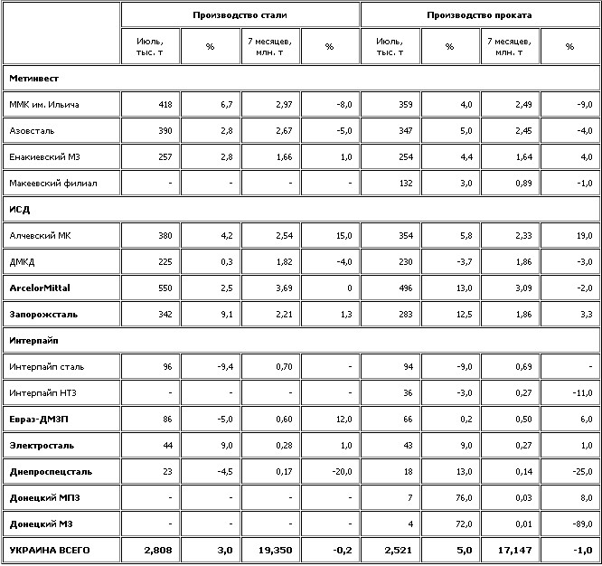 В январе-июле 2013 г. украинские металлургические предприятия сократили производство стали по сравнению с аналогичным периодом прошлого года на 0,2%, до 19,350 млн. т, и проката на 1%, до 17,147 млн. т, тогда как нарастили чугуна на 0,9%, до 16,951 млн. т.